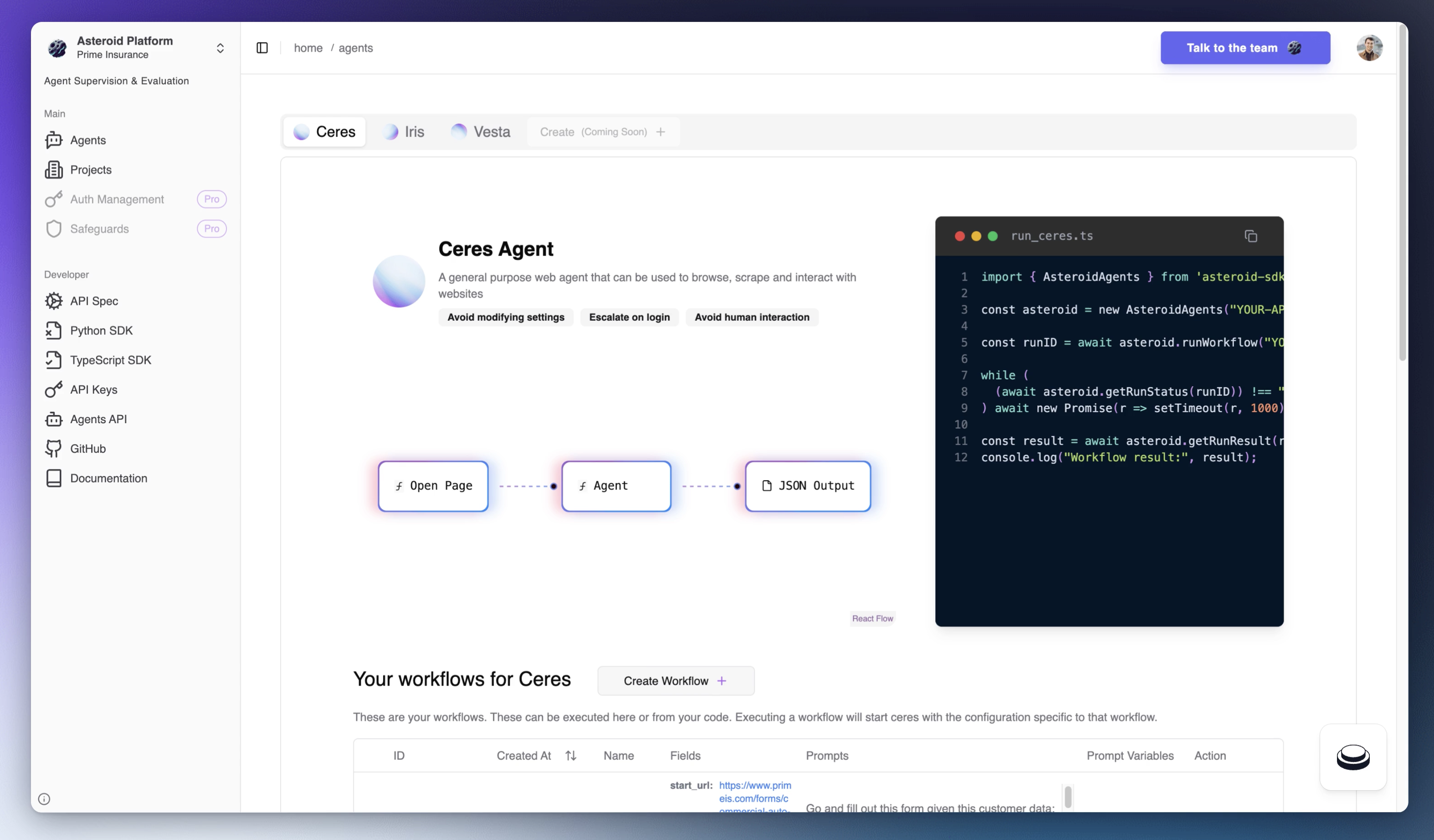 Behind the scenes, Asteroid spins up a secure, headless browser, handles authentication, executes workflows, and seamlessly integrates human review when needed—all without burdening your developers. They ensure the agent improves over time.