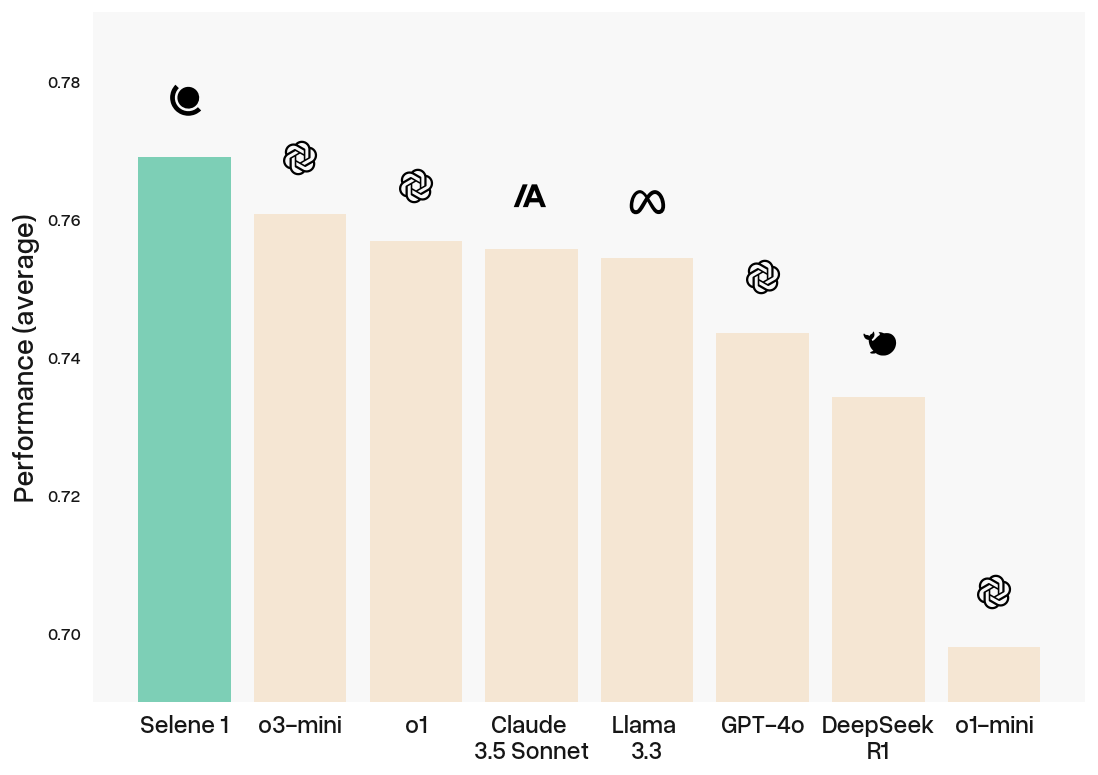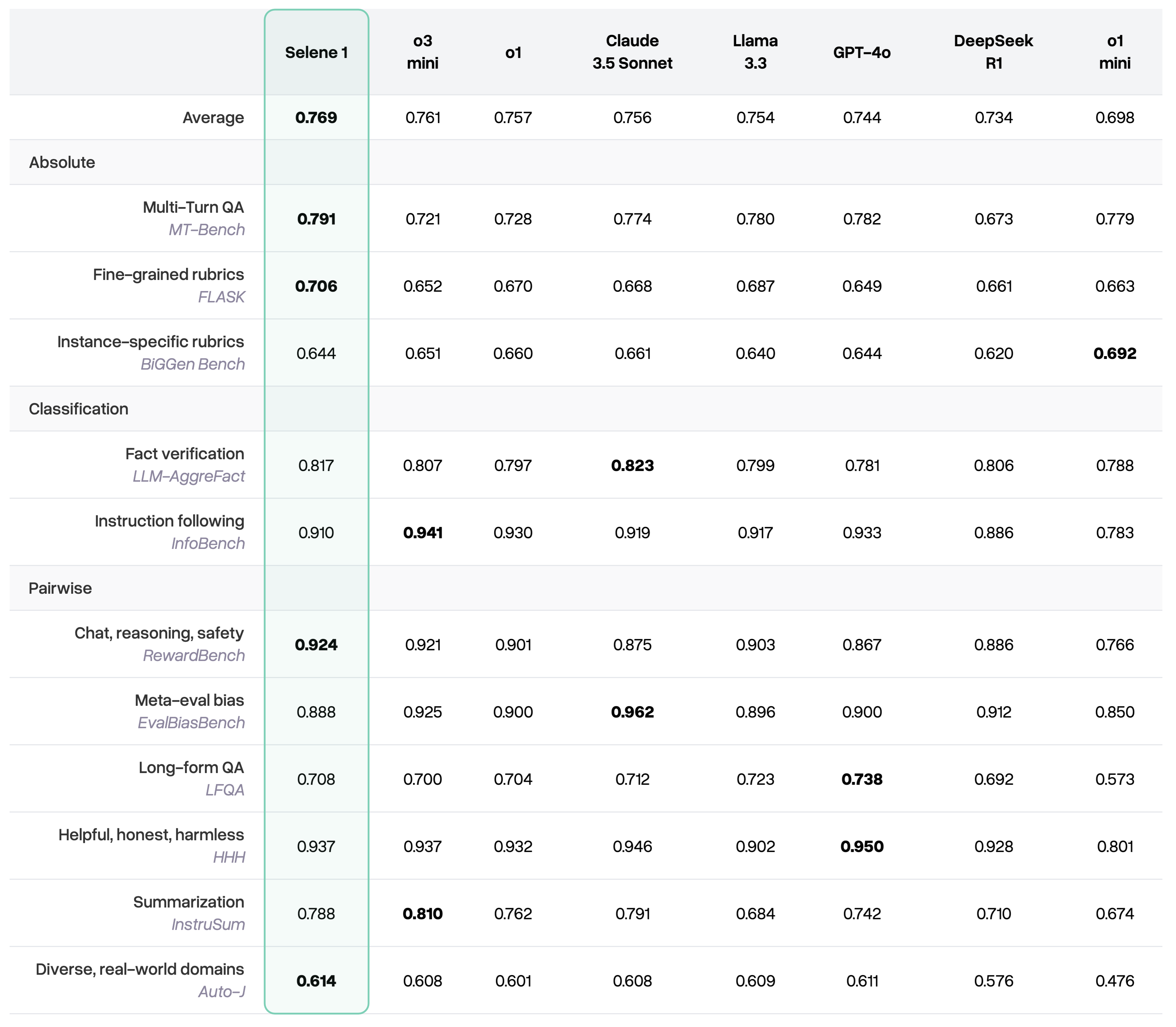 A SOTA model for evals: Selene outperforms all frontier models (OpenAI’s o-series, Claude 3.5 Sonnet, DeepSeek R1, etc.) across 11 benchmarks for scoring, classifying, and pairwise comparisons.