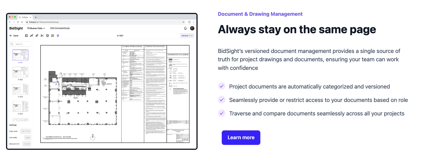 Bidsight presents a solution that streamlines collaboration and data management in pre-construction. The platform serves as a single source of truth for development teams, facilitating a seamless and efficient workflow.