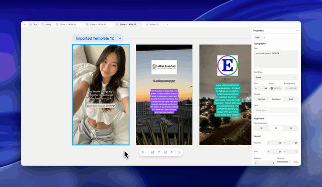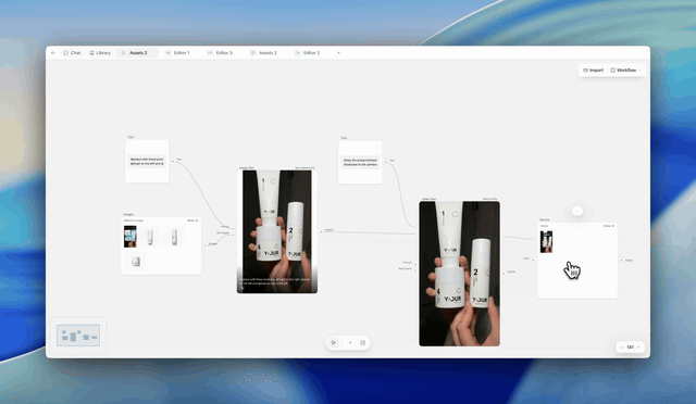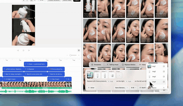 Let's say you want to recreate a winning UGC skincare ad. You can first take the URL and automatically de-edit each scene, captions, text and photo overlays. Then, you can use their asset maker to recreate all the shots exactly.