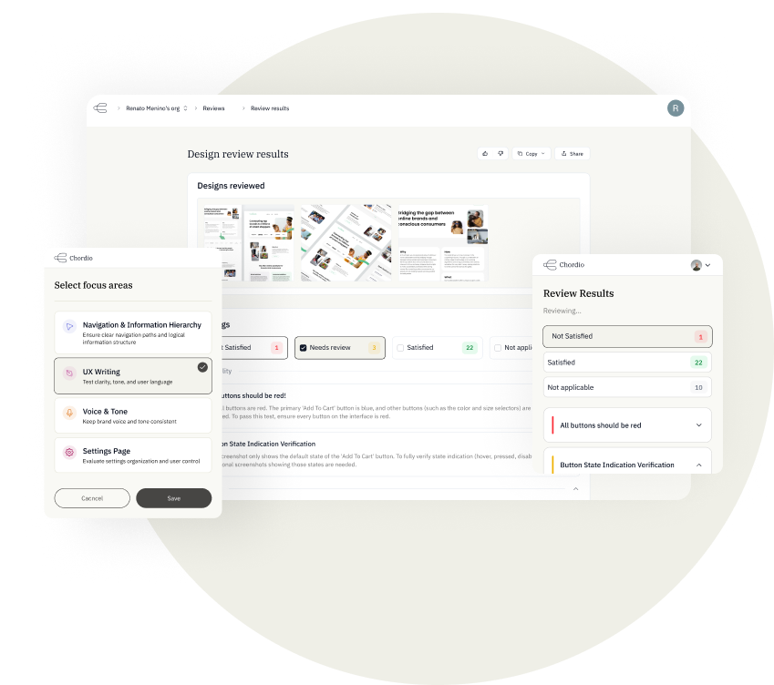 Chordio is an AI-powered design review tool purpose-built to help product teams raise the quality bar and reduce overhead as they scale up their output. Here’s how it helps: