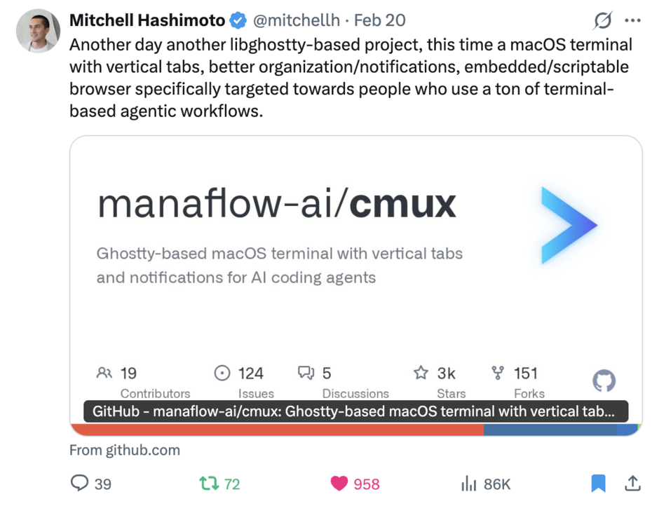 Mitchell Hashimoto, the creator of Ghostty and founder of HashiCorp, shouted out cmux on X.