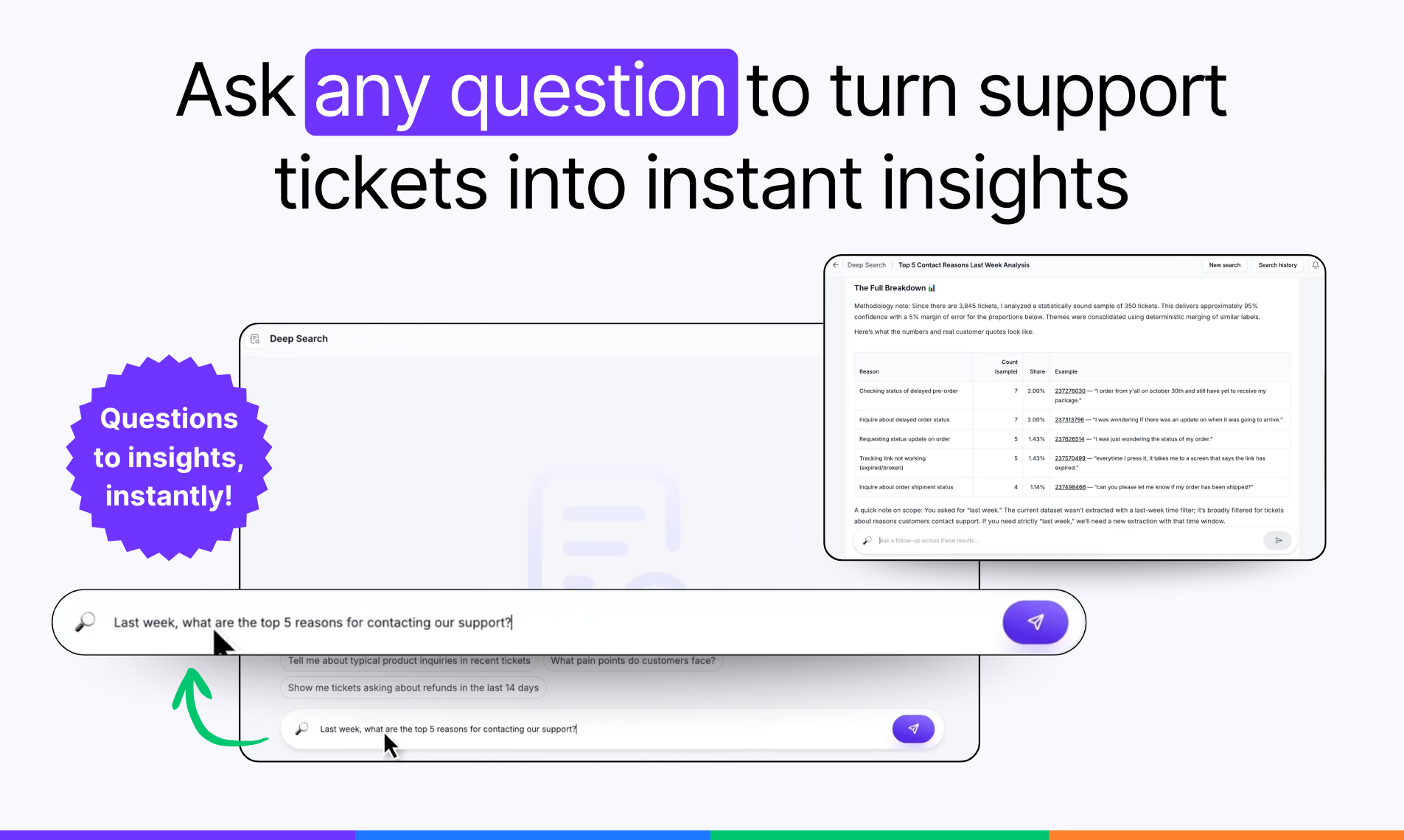 Deep Search is an LLM-powered conversational search engine on top of your support ticket history (your entire support ticket cloud). Instead of digging through dashboards or exports, you ask questions in plain language and get clear, sourced answers straight from recent customer conversations.