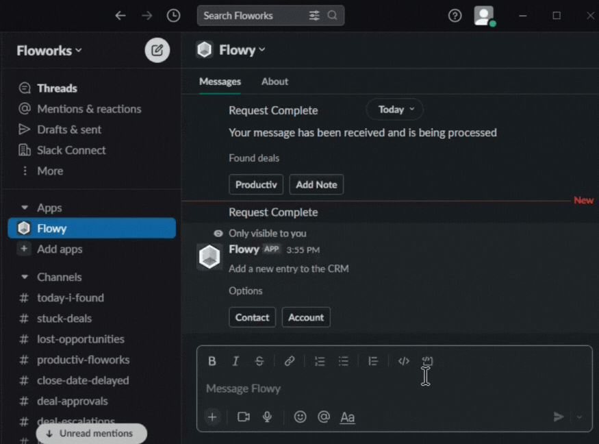Floworks helps sales teams close more deals and stay on top of leads by bringing their CRMs over Slack. For example, after an important sales meeting, a rep can post the summary via slack instead of waiting to get back to their desk to log into Salesforce or HubSpot.