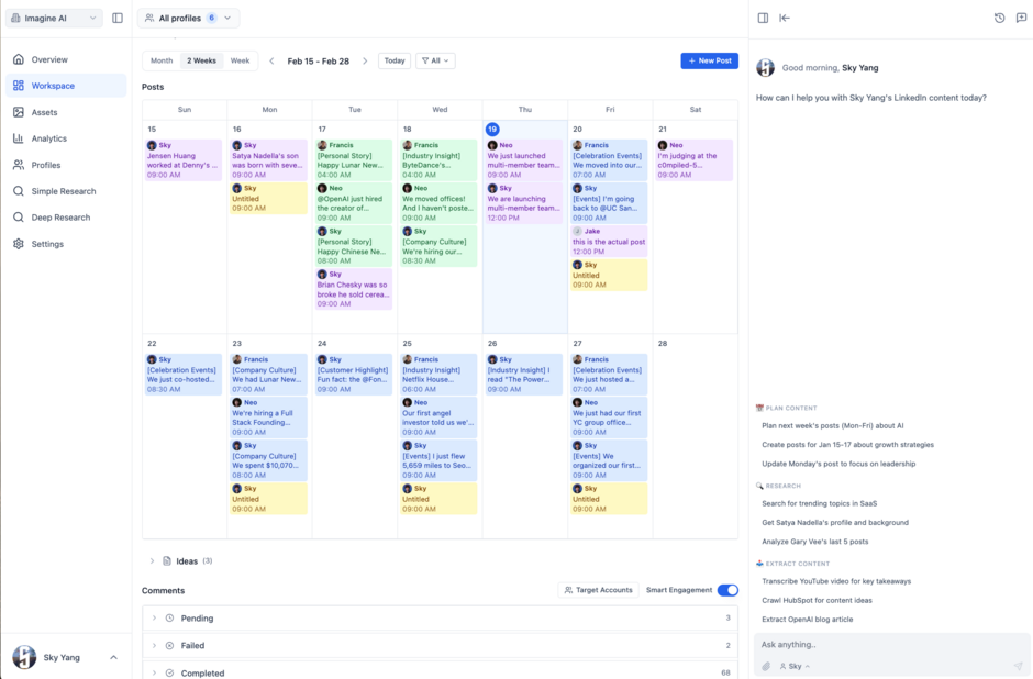 1️⃣ Multi-seat access with coordinated cadence. Your whole leadership team posts through Imagine AI. Not just the CEO. VP Sales, VP Marketing, Head of GTM, whoever needs to be building their presence. Your CEO posts the vision, your VP of Sales posts the proof, your Head of Marketing posts the framework. Same theme, different angles, coordinated ripple cadence.