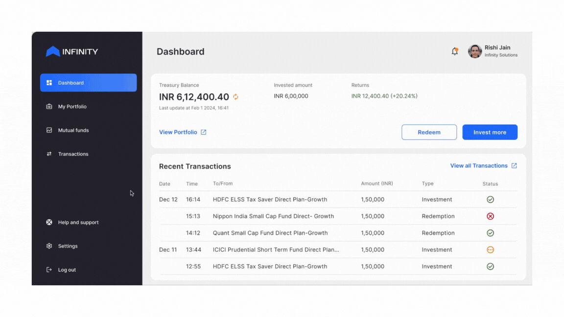 Infinity facilitates businesses to prudently manage surplus funds through a digital platform that can provide custom solutions with access to major financial products like G-secs, corporate bonds, mutual funds, and ETFs. SMBs can earn higher yields on their idle cash without having to worry about liquidity and underlying asset risk.