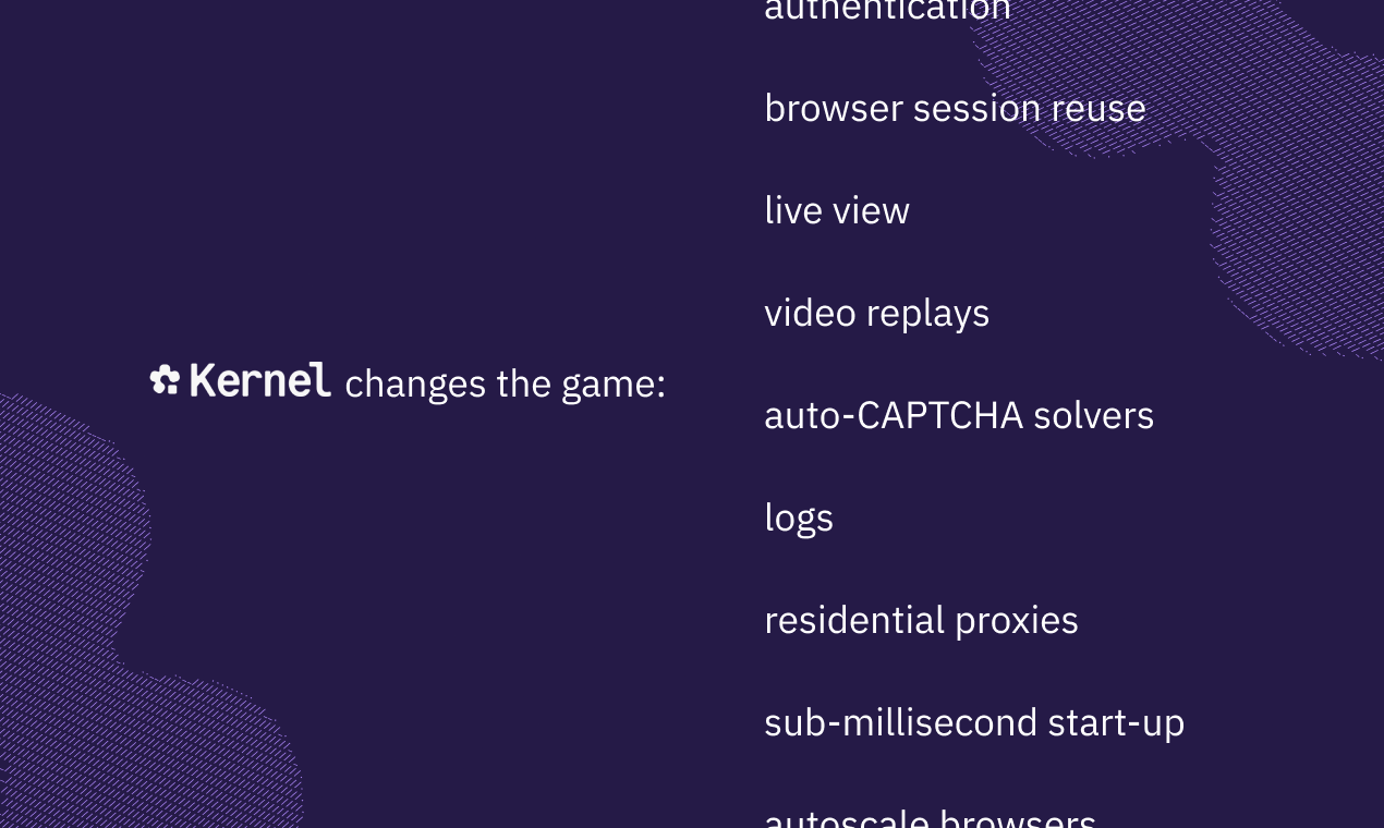 Kernel is the best place in the world to launch web agents and browser automations. They handle the hard parts of running browser infrastructure in the cloud so you don’t have to: spinning up browsers quickly, responsive read/write live view, logs, headless vs. headful mode, residential proxies, and more.