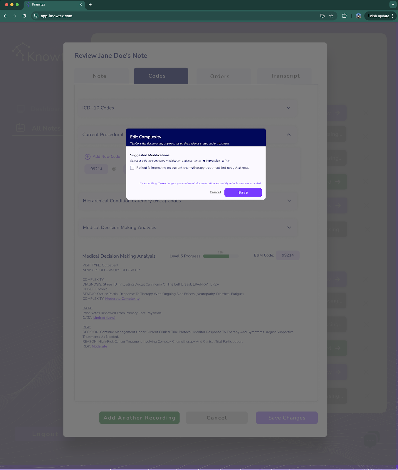 - Risk: Knowtex may suggest inserting the text snippet, “reviewed liver function tests and discussed present chemotherapy effects with the patient,” to increase the documented level of decision-making complexity.