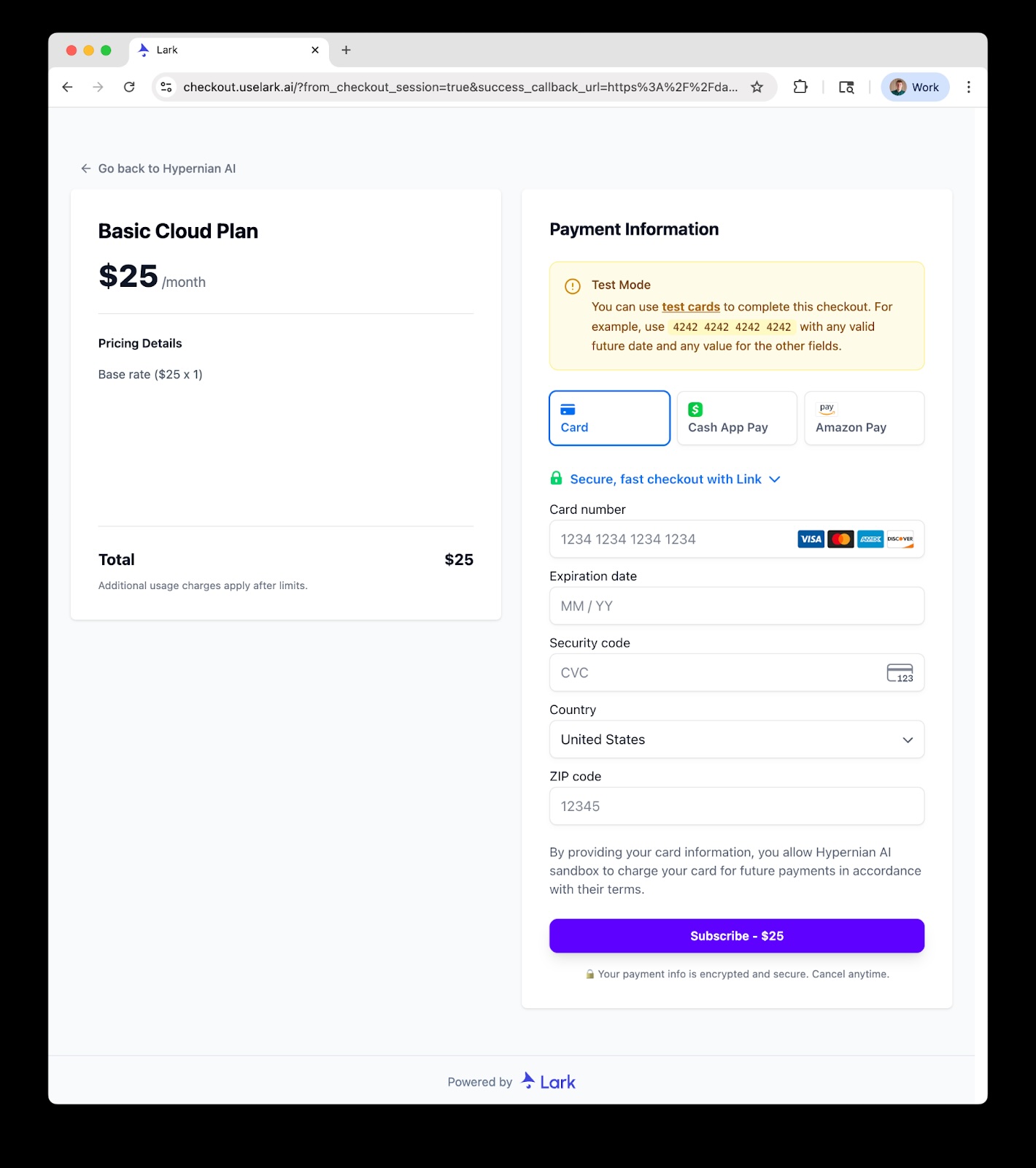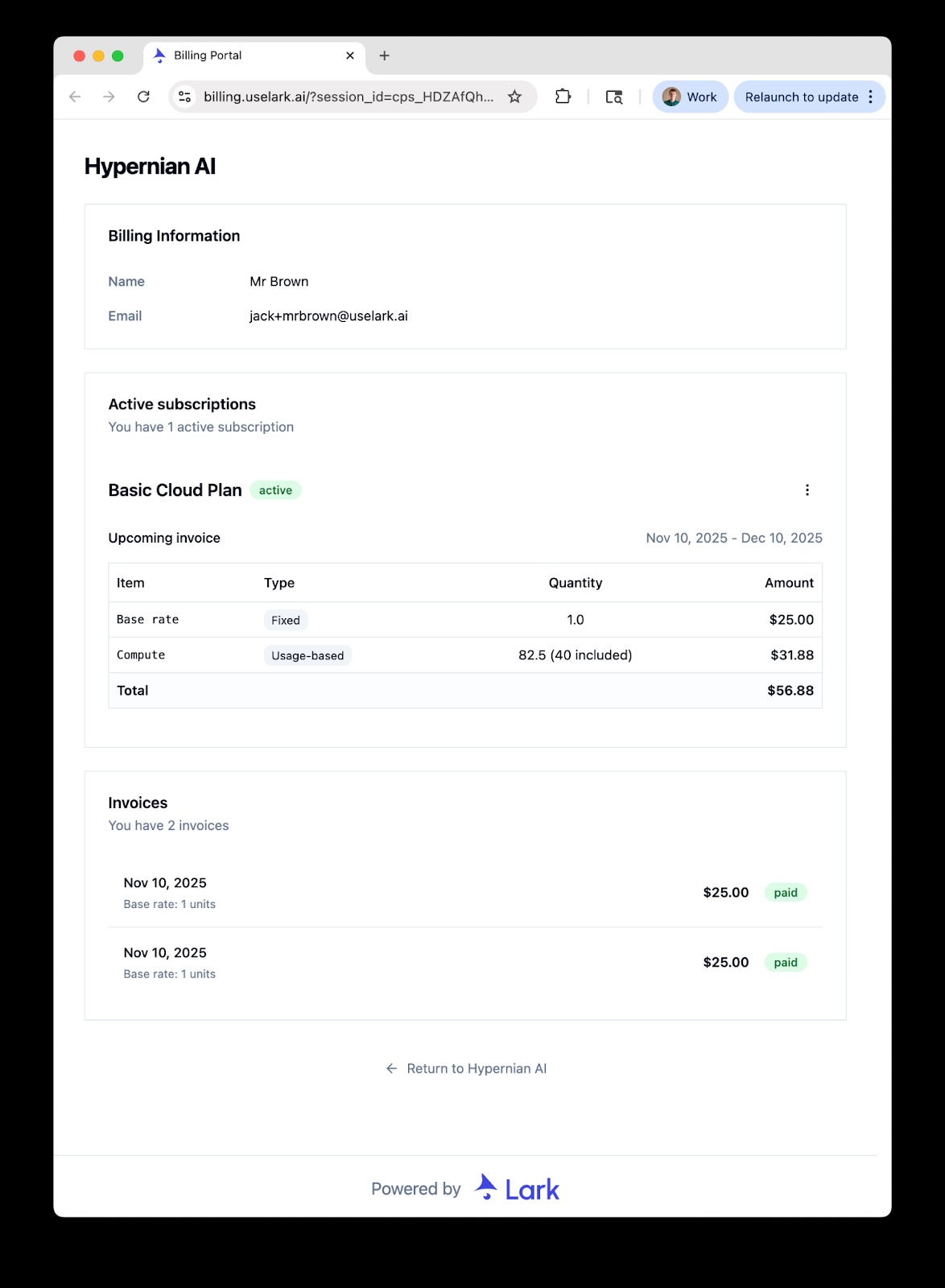 Whether you’re building an AI powered API or a B2B SaaS product, Lark provides everything (including checkout + customer-facing portal) you need to implement complex billing logic without the hassle.