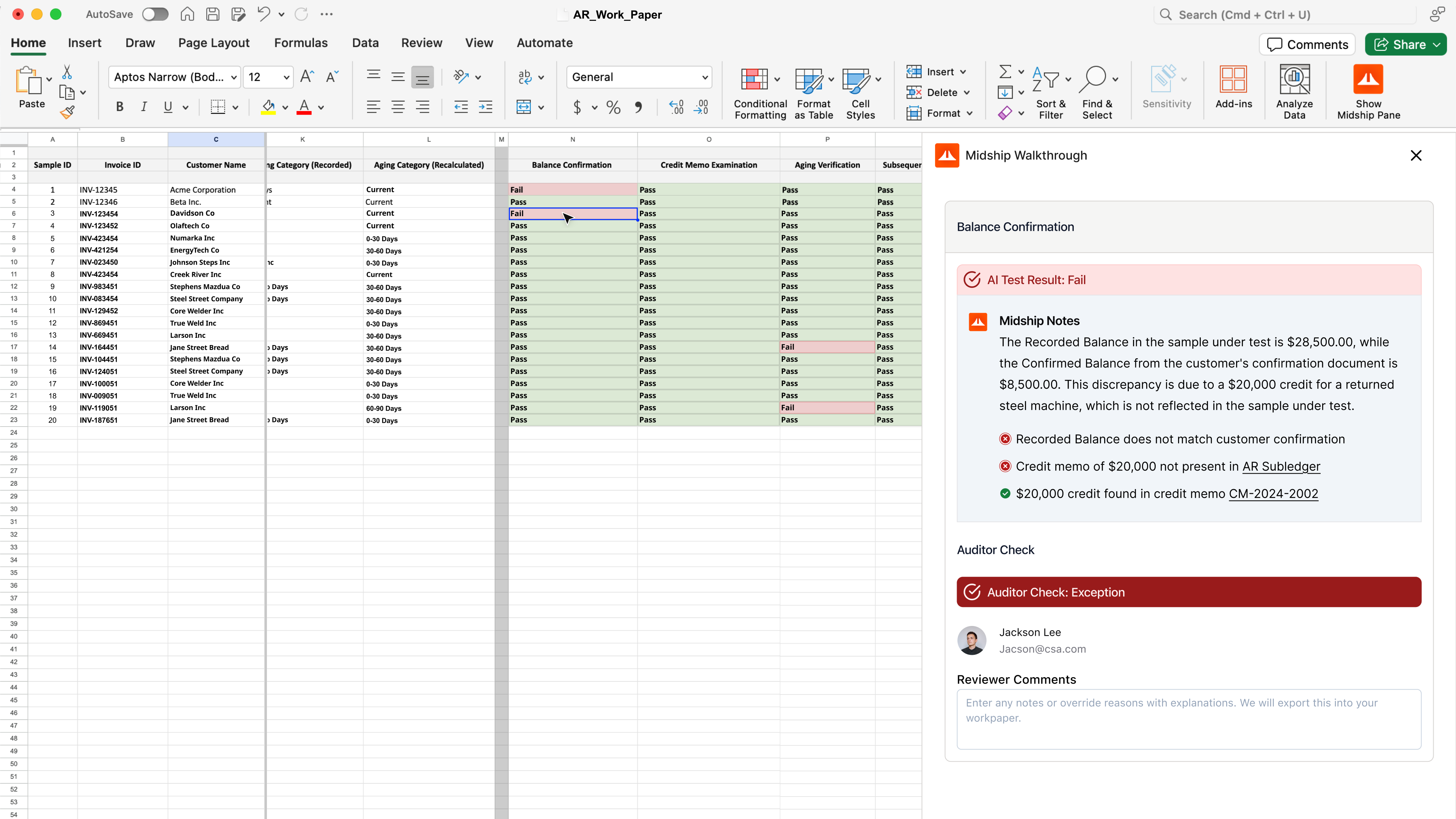 Midship then goes one level further with agents performing audit tests from plans written in natural language. For example, an auditor may plan to check that for each sample, “all amounts match between documents”. Midship performs this check, links to evidence in the source documents and highlights anything that requires review by an auditor.