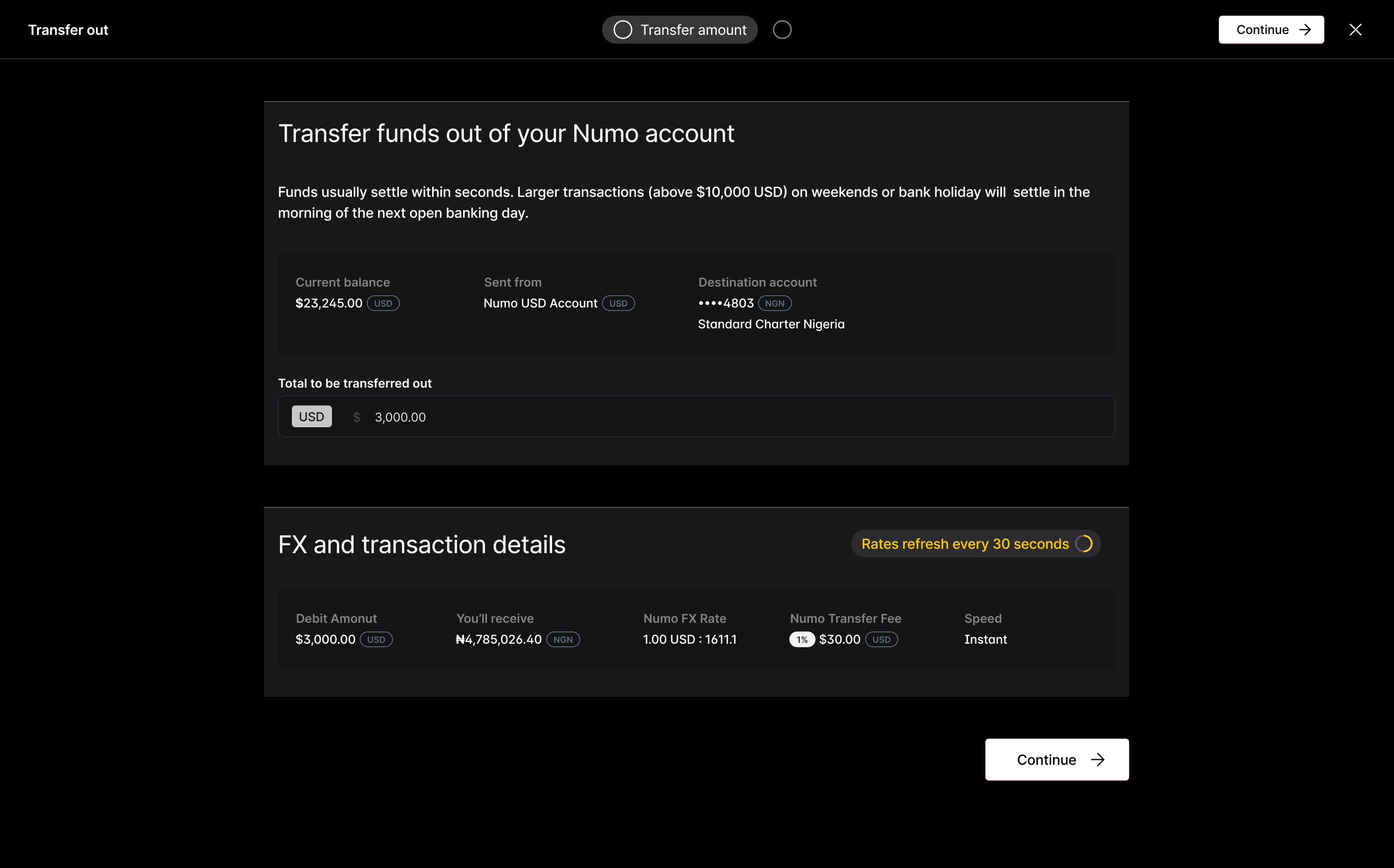 4. Contractors can hold the USD they make stateside until the moment they need to spend it locally. They can transfer funds to their local account within 20 seconds without excessive fees.