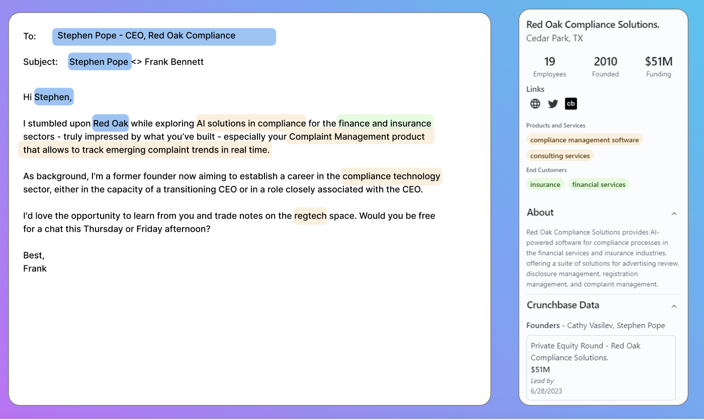 Their AI broker acts much like a human M&A advisor would - it finds targets, diligences them, and then reaches out to them on your behalf. However, unlike a human, their AI broker is powered by proprietary recommendation engines and custom-built AI agents and can do this for thousands of companies at a time 👀