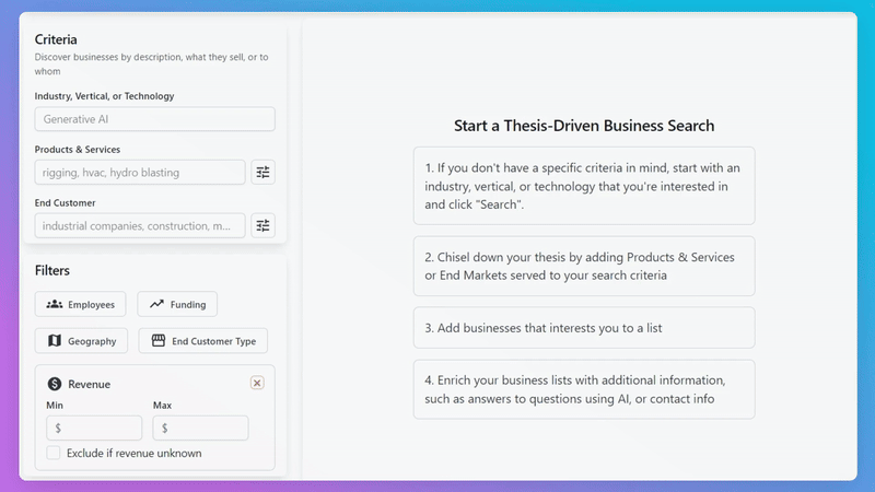 Their web-enabled AI agents conduct automated diligence, vetting thousands of companies to deliver a precision-targeted shortlist in minutes, not days.
