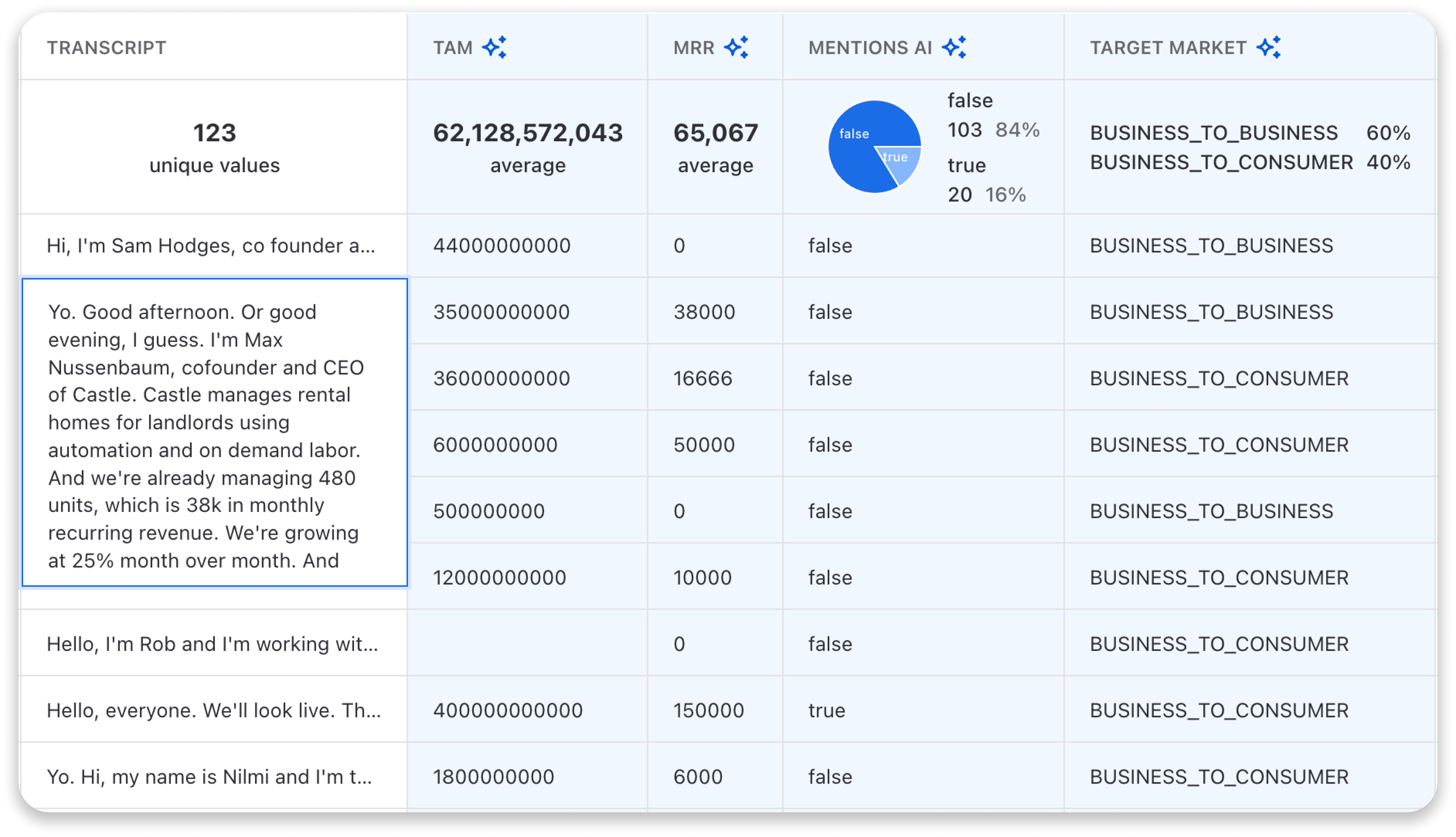 Here they started with a database of all the public demo day videos and extracted some of the most interesting business metrics — without needing to watch hundreds of videos.