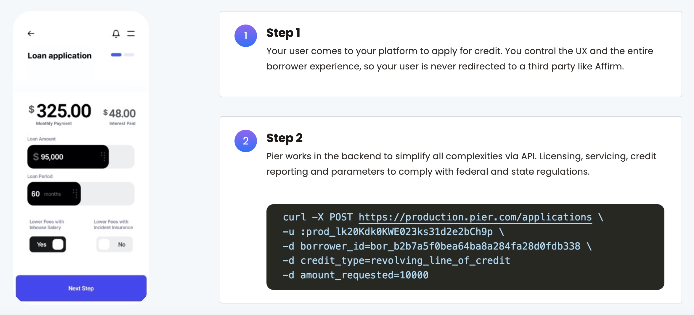 With Pier, companies can offer credit to their borrowers within their own app, while Pier's API seamlessly handles all operations behind the scenes.