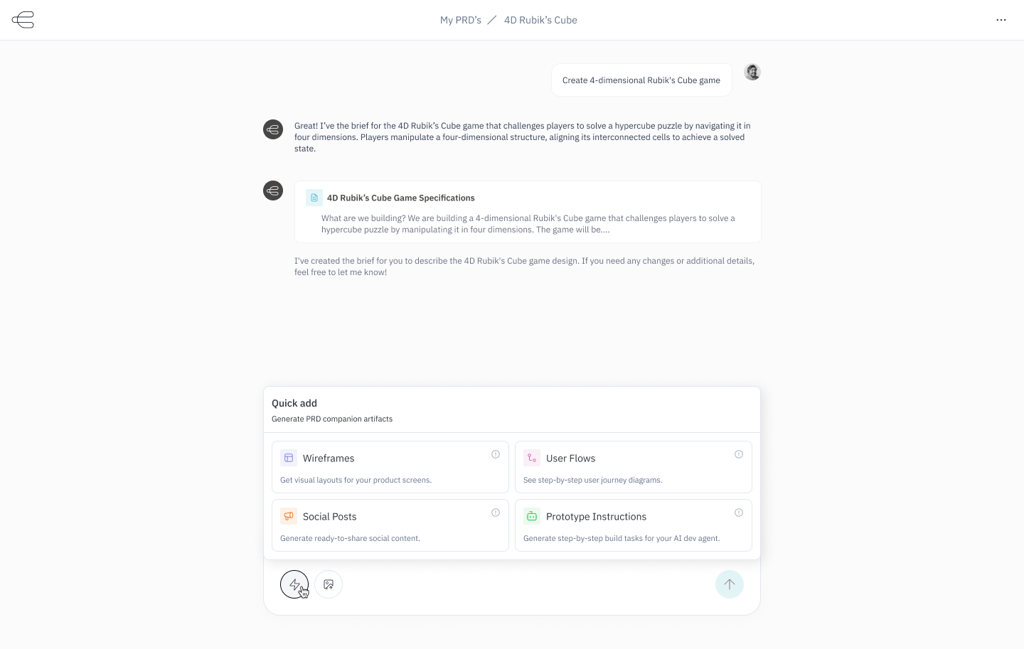 Further, it’s contextual. It helps you quickly capture the essence of your existing product (enter the homepage URL) to craft PRDs that cater to your personas and existing workflows.