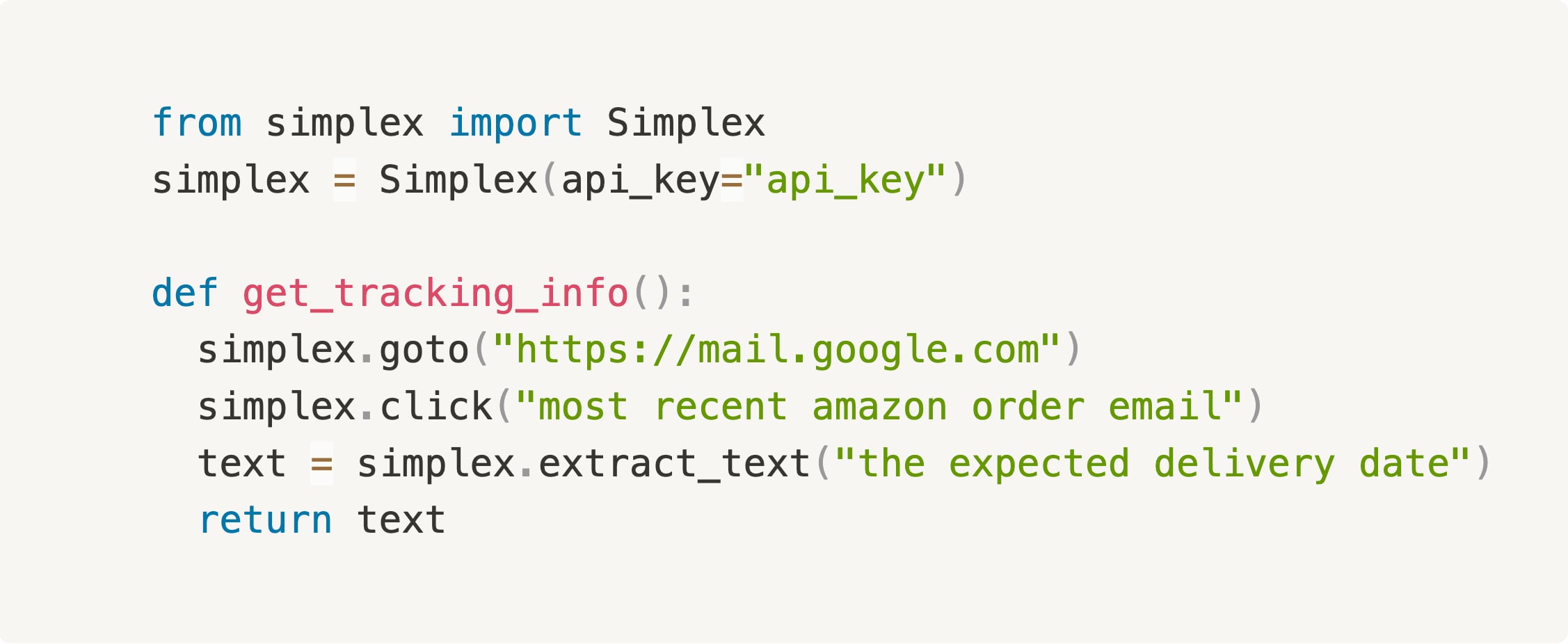 With Simplex, writing a function to pull tracking information from your email is as easy as this: