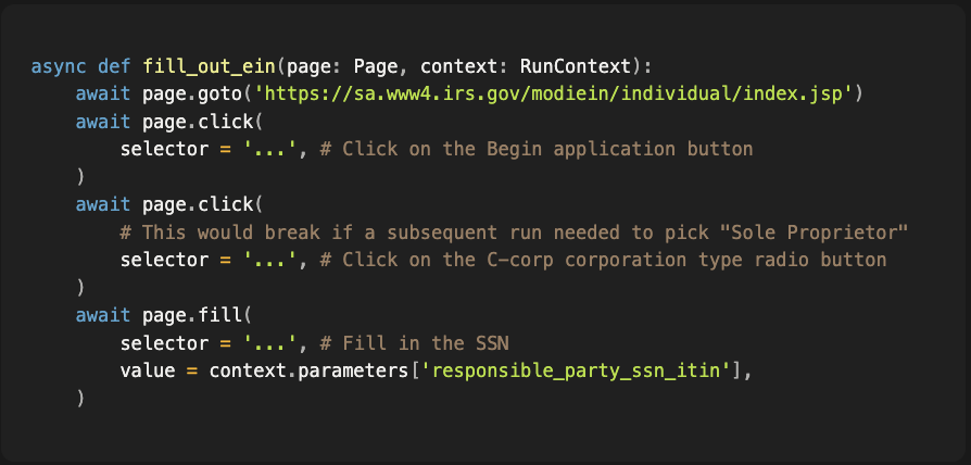 What’s missing: it doesn’t know why it’s clicking “Corporation,” what should appear next, or how to recover if the DOM shifts (or the portal is down). That’s the gap they close in the next section (intent metadata + deterministic replay with targeted fallbacks).