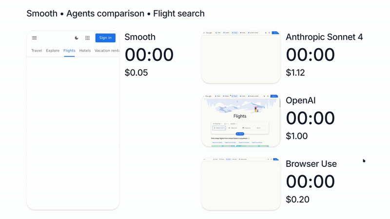 TL;DR: Smooth is an AI browser agent that can perform actions autonomously on the web using mouse and keyboard. It’s the most reliable browser agent yet, while also being 5 times faster, and 7 times cheaper than any other browser agent on the market.