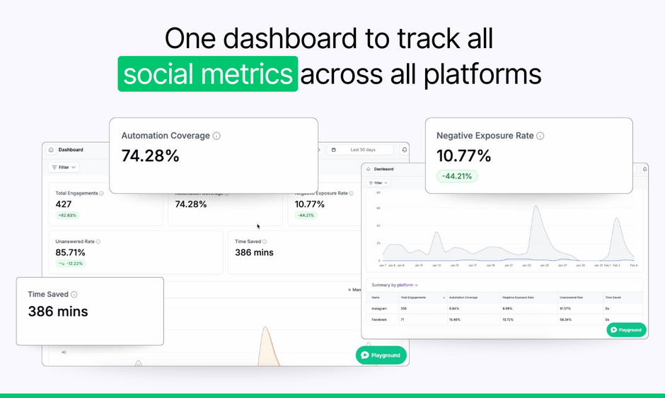Real-time dashboard with engagements, automation coverage, sentiment distribution, negative exposure rate, and unanswered rate across all platforms