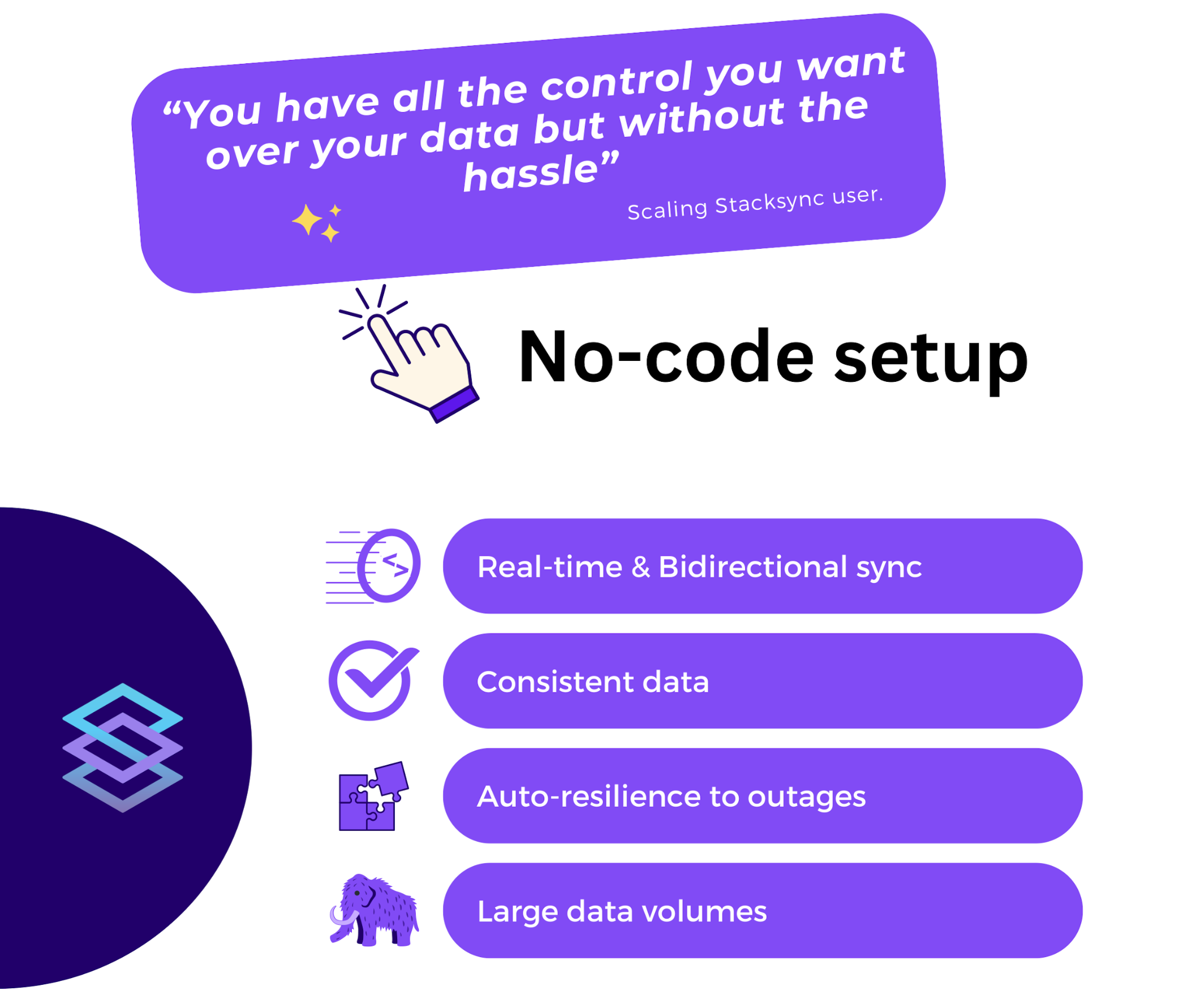With two-way sync, Stacksync turns your database into a read+write interface to your CRM. So instead of reading and writing data from an API, just do it with SQL queries in the database that you already know and love. Whenever data is updated in your database, it instantly syncs to your CRM and vice-versa. Stacksync is different because it is the first tool that delivers consistent data you can trust in real-time. Stacksync just works. The setup is done in less than 5 minutes, without a single line of code.