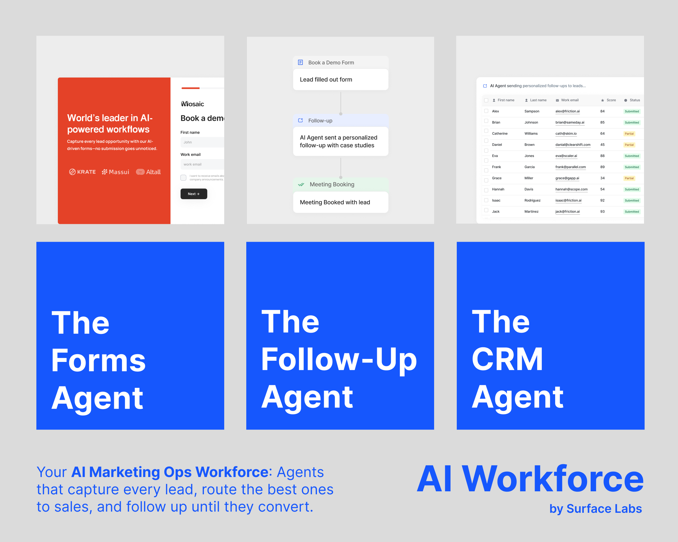 For too long, marketers have been stuck fixing ops instead of building campaigns. Surface Labs is building the first AI Workforce for Marketing Ops — a team of AI Agents that run your inbound workflows, boost conversions, and cut workloads by 80%.