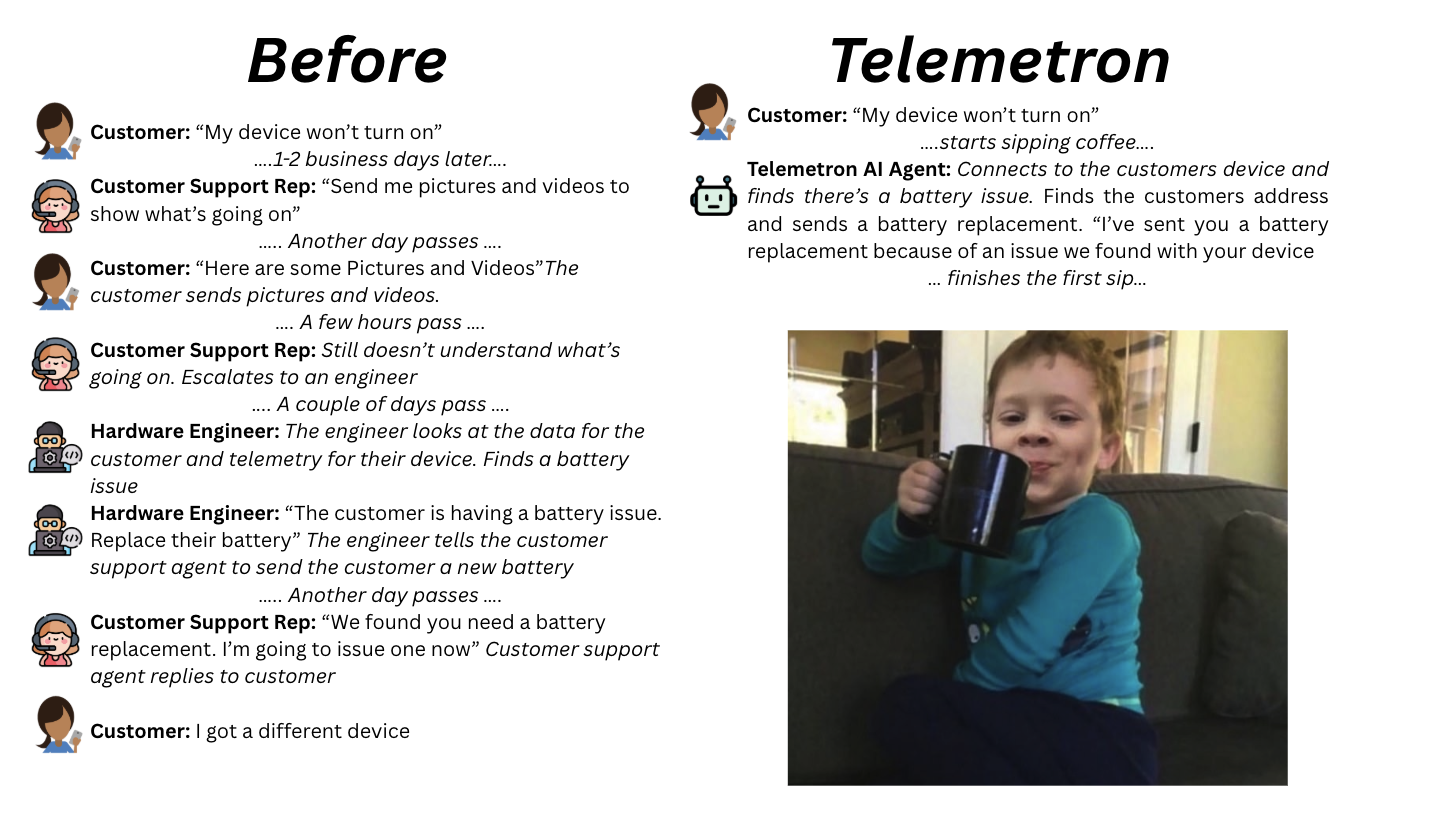 Telemetron: End-To-End Support Platform for Hardware Companies. They handle product support, troubleshooting, field service management, and more.