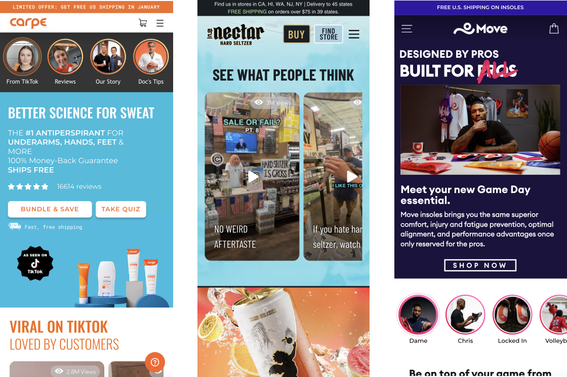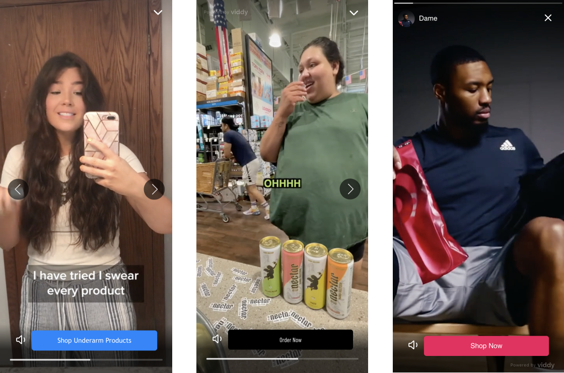Viddy offers a solution by creating familiar video user interfaces (like Instagram Stories, animated carousels, and swipeable TikTok feeds), that can be seamlessly integrated into an e-commerce website. Examples of these interfaces can be viewed below: