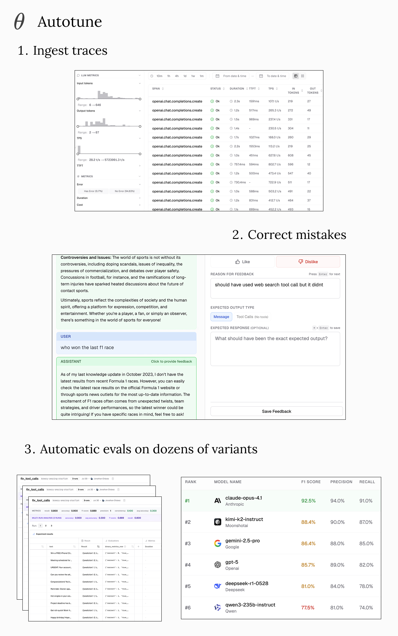 They are also introducing Autotune, a way to do automatic evaluation on dozens of models and prompt optimization based on a few human samples.
