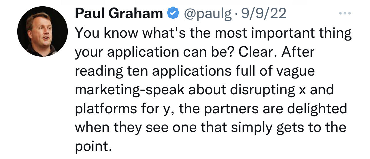 And so, we'll ask questions sometimes to figure this out. But there's such a clear delineation for me as an application reader about someone that is clearly communicating in a very crisp way versus where it's this brain teaser and I'm trying to pull out, or it's just like tons of work for me to pull out the key facts from the application, okay? And I think this is broadly applicable if you're trying to convince someone to buy your product, or you're trying to convince someone to work with you, or you're trying to convince an investor to invest in your startup, and they don't even understand what you're talking about, you have already lost, right? Simply going for coherent understanding should always be the first thing you do before you're trying to sell someone, right?