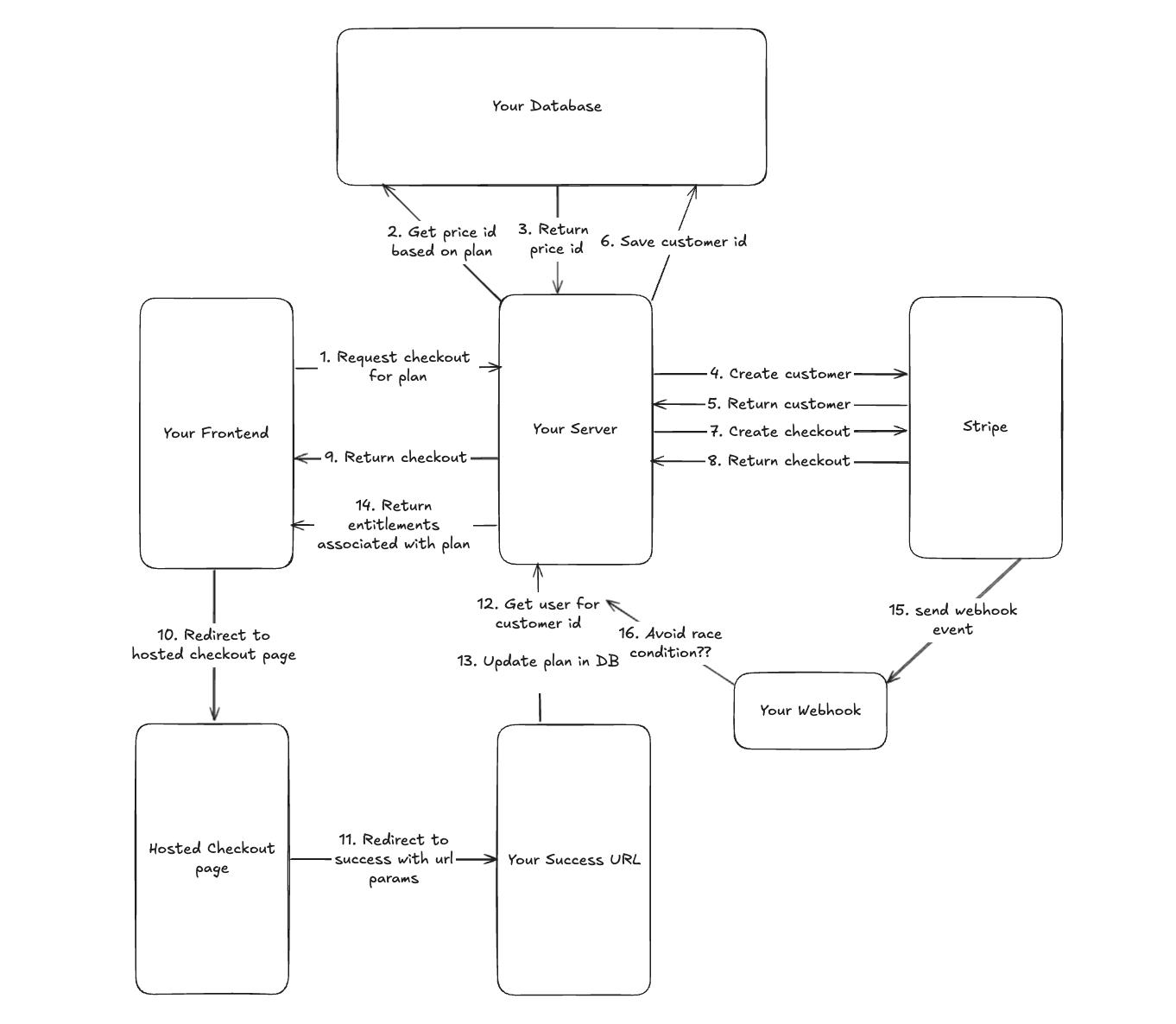 The result is a bunch of glue code that you have to maintain to keep your app’s DB in sync with what happened in your payment processor. You sync your DB through webhooks which are brittle, create race conditions, and often one of the hardest parts of your app to test.