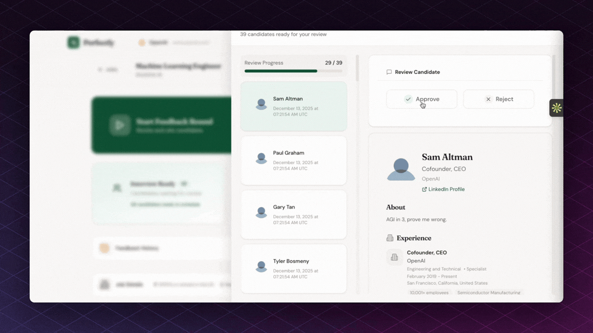 Perfectly does deep research into each candidate. Beyond surface level experience, it predicts their interests, trajectory, and how they’ll actually do in the interviews and on the job.
