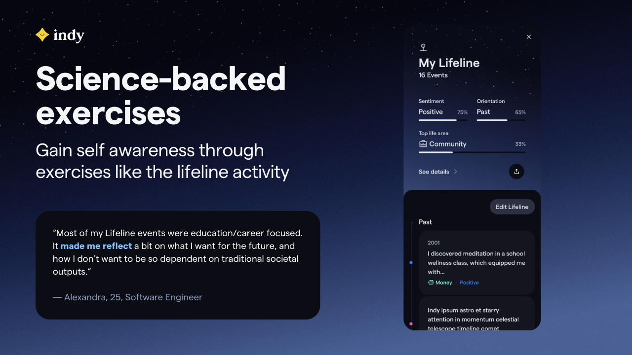- Problem-solving when stuck: When friction shows up, Indy uses science-backed frameworks to help users identify what’s actually blocking progress and choose a small next step.
