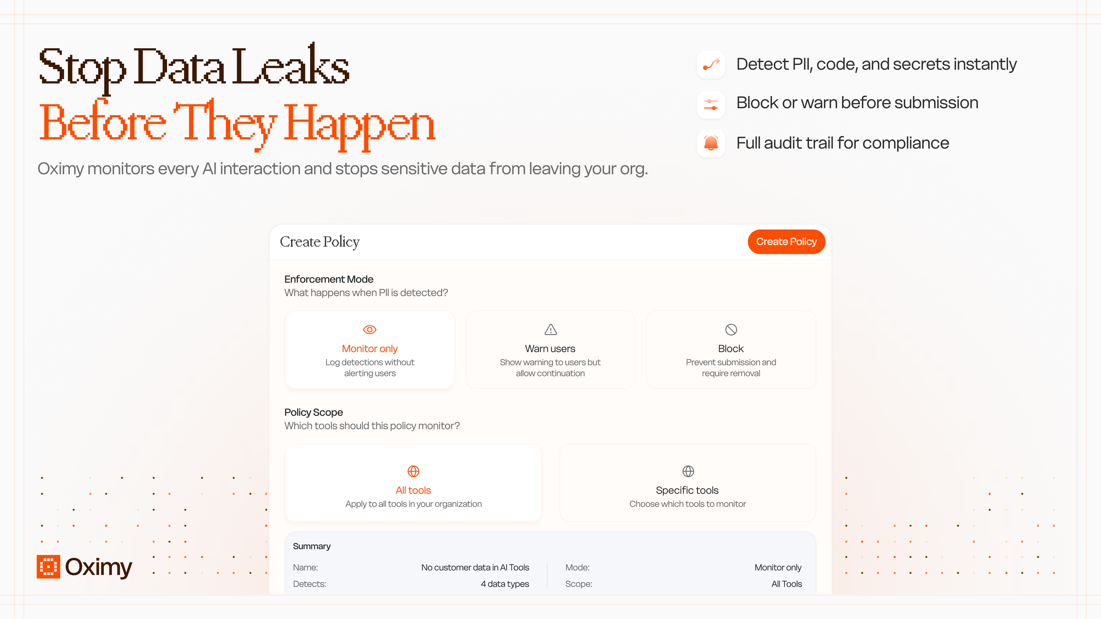 Oximy monitors data flows to AI tools in real time. You can set policies, get alerts, and block sensitive data from reaching unauthorized tools.