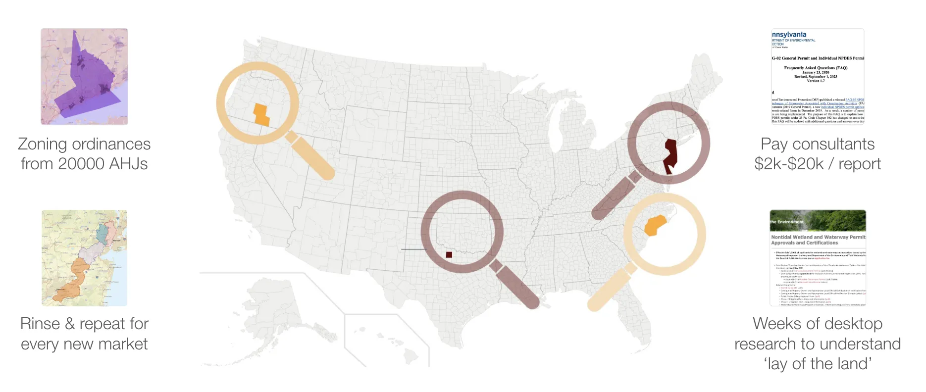 Critical information lives inside thousands of scattered, inconsistent zoning codes, permits, and local records. Teams miss high-potential sites, waste months on weak ones, and get outpaced by competitors.